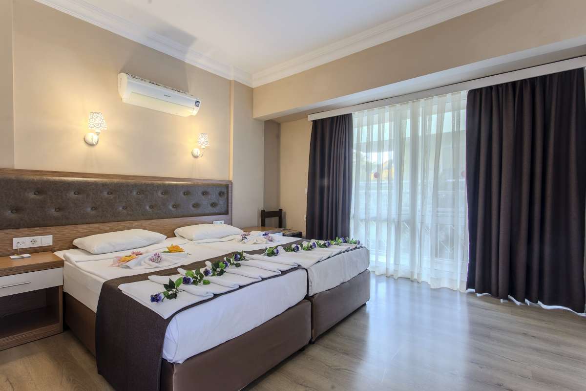 Ana ve yan binadaki odalar taş zemin küvet yada duş/WC saç kurutma makinası , telefon, uydu bağlantılı televizyon, mini bar, (geliş gününde su ile doldurulur.) kasa (ücretli) 2 adet klima (bağımsız ayarlanabilir)